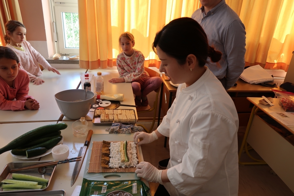 4月4日(金)、クラン市にあるOsnovna Šola Staneta Žagarja Kranj(スタネット・ザーガルヤ・クラン小学校)にて、日本大使公邸料理人である藤川美由紀シェフによる和食ワークショップを開催しました。