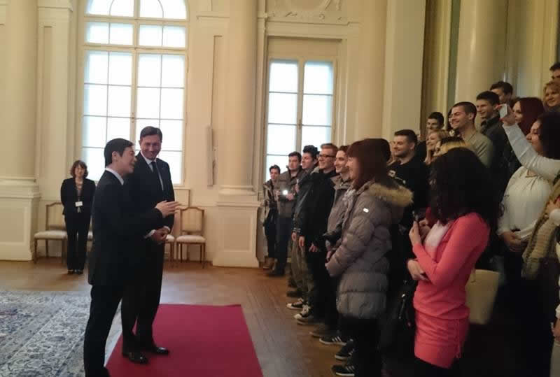 Svečani predaji mojih poverilnih pisem je prisostvovalo tudi okoli 40 študentov, ki so imeli tako priložnost spremljati delovanje predsednika države, ogled slovesnosti je bil zanje posebna družabna izkušnja. Tudi sam verjamem, da sotakšne poteze zelo pomembne – družba sloni na mladih, priložnost, da sodelujejo ri tej slovesnosti, je koristna za vse. Po najinem začetnem pogovoru sva se s predsednikom Pahorjem na kratko pogovorila tudi s študenti. Kako lepo je bilo pogledati v njihove obraze, zazrte v svetlo prihodnost! Dobro se mi zdi, da se širijo raznolike izmenjave mladih generacij obeh držav. |