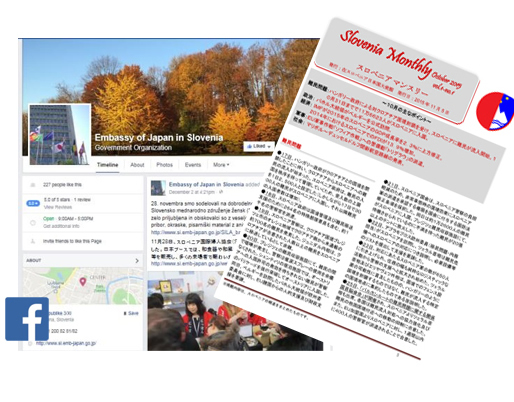 Po svojem prihodu sem poskusil zbližati odnose med nami, zato smo na veleposlaništvu začeli izdajati informativni bilten Slovenian Monthly, ki ga objavljamo tudi na našem profilu na Facebooku. S središčno fotografijo, ki bralcu ponuja hiter vpogled v obravnavano temo, vizualno predstavljamo naše delovanje. Različne teme povzemamo na enostaven in razumljiv način na 5 straneh v japonskem jeziku. S pomočjo biltena je vsak mesec predstavljen pregled trendov v Sloveniji. S temi prizadevanji si želimo poglobiti zanimanje za Slovenijo. Obiščite našo spletno stran in nas všečkajte na Facebooku. |