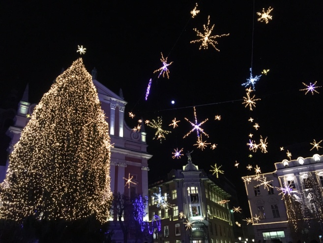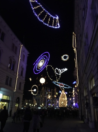 Od večera 27. novembra mestne ulice Ljubljane krasi božična razsvetljava. Uživamo lahko v pogledu na velikansko jelko, ki jo je mestuv znak prijateljstva podarila Češka republika in ki stoji v središču mesta, na Prešernovem trgu ob Tromostovju. Mesto sámo je prekrasno; po dolgih letih se vračam v spomine na mladost v Evropi, kar me globoko gane. Nekaj fotografij božične okrasitve mesta si lahko ogledate spodaj. |